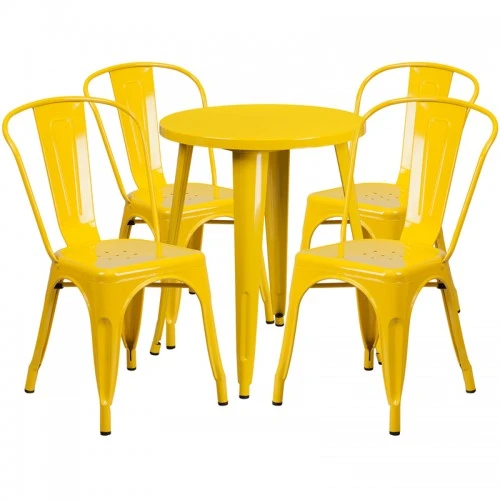 Complete your dining room, restaurant or patio with this chic bar table and chair set. This colorful set will add a retro-modern look to your home or eatery. Table features a smooth top and protective rubber floor glides. The stylish bistro style barstools features a curved, vertical slat back. This 5 piece table set is designed for indoor and outdoor settings. For longevity, care should be taken to protect from long periods of wet weather. The possibilities are endless with the multitude of environments in which you can use this table, for both commercial and residential spaces. [CH-51080BH-4-30CAFE-YL-GG]