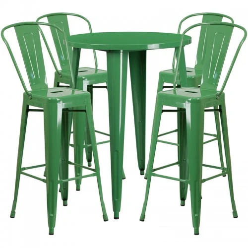 Complete your dining room, restaurant or patio with this chic bar table and chair set. This colorful set will add a retro-modern look to your home or eatery. Table features a smooth top and protective rubber floor glides. The stylish bistro style barstools features a curved, vertical slat back. This 5 piece table set is designed for indoor and outdoor settings. For longevity, care should be taken to protect from long periods of wet weather. The possibilities are endless with the multitude of environments in which you can use this table, for both commercial and residential spaces. [CH-51090BH-4-30CAFE-GN-GG]