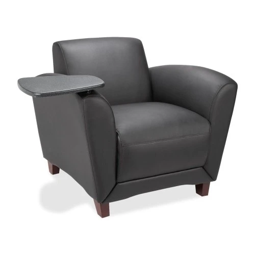 Chair with a convenient writing tablet is part of the Lorell Reception Seating Collection that is made with an open, inviting modern design and bonded black leather. Tablet swings out for a versatile worksurface. Back meets the seat at a slight obtuse angle for a relaxing wait. Sides rise for arm rests. Comfortable, thick foam cushions are CA117 fire-retardant. Four sturdy, wooden legs with a Mahogany finish support the chair.