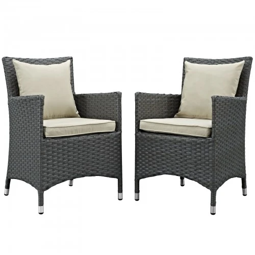 Outfit your patio with an imaginative outdoor sectional series of exceptional quality. The Sojourn series offers a robust seating experience that easily rearranges according to usage. Outfitted with industry-leading Sunbrella fabric cushions, synthetic rattan weave, UV protection, powder-coated aluminum frame, immensely enjoy your outdoor time with a series that enhances patio, backyard or poolside areas. This installment of the series is an Outdoor Patio Dining Set. Set Includes: Two – Sojourn Dining Armchair