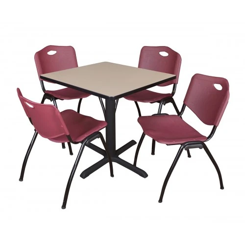 - Versatile table & chair set includes one 30-inch square Cain table and 4 Burgundy “M” Stack Chairs