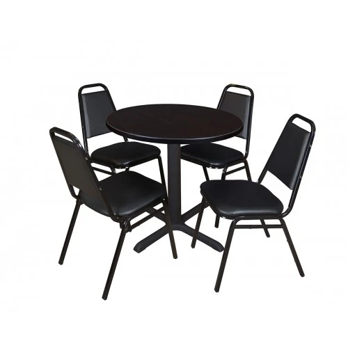 Whether you’re planning a lounge, Cafe, library, breakroom or restaurant, let the Cain Collection take you there. These versatile tables are at home in stylish Cafe or coffee shop settings as well as lunch rooms. This set includes one 30-inch round Cain table and four Restaurant Stack Chairs. The table is constructed of a thermal fused melamine Mocha Walnut laminate tabletop that is 1-inch thick and finished with a black T-Mold edge band. Laminates are scratch, stain and scald resistant and wipe clean easily. The stylish X-Base is constructed of a tubular steel post and solid steel X-Base. Hidden adjustable glides keep the tabletop level and are easy to adjust. Inspired by the classic black Cafe look, the Restaurant Stack Chair is designed for use in almost any setting. The water-repellent vinyl seat and back easily wipe clean with a damp cloth. Reinforced cross-bracing on the black metal frame make this versatile stack chair suitable for every day wear and tear. It can easily be stored away in stacks of 12. All Regency chairs are backed by a 5-year limited manufacturer’s warranty on chair bases and frames and a 2-year limited manufacturer’s warranty on chair mechanisms and upholstery. Cain tables are backed by a 10-Year Limited Manufacturer’s Warranty.