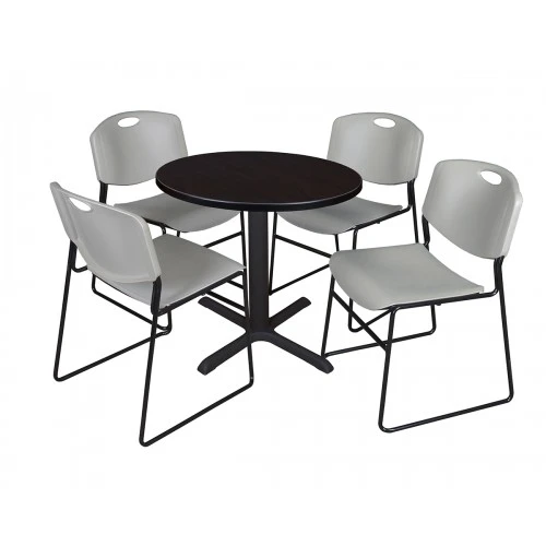 - Versatile table & chair set includes one 30-inch round Cain table and 4 Grey Zeng Stack Chairs