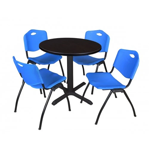 Whether you’re planning a lounge, Cafe, library, breakroom or restaurant, let the Cain Collection take you there. These versatile tables are at home in stylish Cafe or coffee shop settings as well as lunch rooms. This set includes one 30-inch round Cain table and four Blue “M” Stack Chairs. The table is constructed of a thermal fused melamine Mocha Walnut laminate tabletop that is 1-inch thick and finished with a black T-Mold edge band. Laminates are scratch, stain and scald resistant and wipe clean easily. The stylish X-Base is constructed of a tubular steel post and solid steel X-Base. Hidden adjustable glides keep the tabletop level and are easy to adjust. The sturdy, lightweight “M” stack chair by Regency offers durability, style and value. Its black metal frame and contoured plastic seat and back are strong and easy to clean. This versatile stack chair easily stores away in stacks of 12 and features a built in handle for easy mobility. All Regency chairs are backed by a 5-year limited manufacturer’s warranty on chair bases and frames and a 2-year limited manufacturer’s warranty on chair mechanisms and upholstery. Cain tables are backed by a 10-Year Limited Manufacturer’s Warranty.